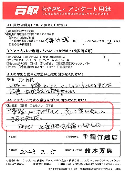 お車のご相談・ 査定だけでもOK! カンタン 入力 30秒 アップルがブランド買取始めました! お電話でも受付中! 受付時間9:30~18:30 052-711-8400 お車のご相談・ 査定だけでもOK! カンタン 入力 30秒 アップルがブランド買取始めました! お電話でも受付中! 受付時間9:30~18:30 052-711-8400 アップルがブランド買取始めました! お電話でも受付中! 受付時間9:30~18:30 052-711-8400 店舗情報 在庫車 スタッフ紹介 ブログ お客様の声 キャンペーン 無料査定 click お客様の声 ご記入日: 2023/02/05 W様 車名:トヨタ C-HR 満足度★★★★★接客がすばらしく、高く買い取ってもらえました。なので、2台目もお願いしました。 前へ 次へ お客様の声一覧を見る