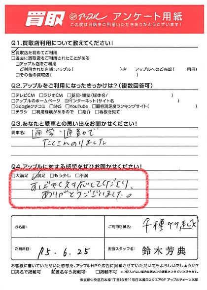 お車のご相談・ 査定だけでもOK! カンタン 入力 30秒 アップルがブランド買取始めました! お電話でも受付中! 受付時間9:30~18:30 052-711-8400 お車のご相談・ 査定だけでもOK! カンタン 入力 30秒 アップルがブランド買取始めました! お電話でも受付中! 受付時間9:30~18:30 052-711-8400 アップルがブランド買取始めました! お電話でも受付中! 受付時間9:30~18:30 052-711-8400 店舗情報 在庫車 スタッフ紹介 ブログ お客様の声 キャンペーン 無料査定 click お客様の声 ご記入日: 2023/06/25 K様 車名:トヨタ アクア 満足度★★★★すばやく対応してくださり、ありがとうございました。 前へ 次へ お客様の声一覧を見る