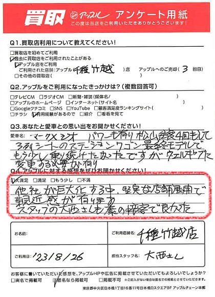 お車のご相談・ 査定だけでもOK! カンタン 入力 30秒 アップルがブランド買取始めました! お電話でも受付中! 受付時間9:30~18:30 052-711-8400 お車のご相談・ 査定だけでもOK! カンタン 入力 30秒 アップルがブランド買取始めました! お電話でも受付中! 受付時間9:30~18:30 052-711-8400 アップルがブランド買取始めました! お電話でも受付中! 受付時間9:30~18:30 052-711-8400 店舗情報 在庫車 スタッフ紹介 ブログ お客様の声 キャンペーン 無料査定 click お客様の声 ご記入日: 2023/08/26 H様 車名:トヨタ マークXジオ 満足度★★★★★他社が巨大化する中、堅実な店舗展開で親近感があります。スタッフの大西さんも、素の接客で良かった。 前へ 次へ お客様の声一覧を見る