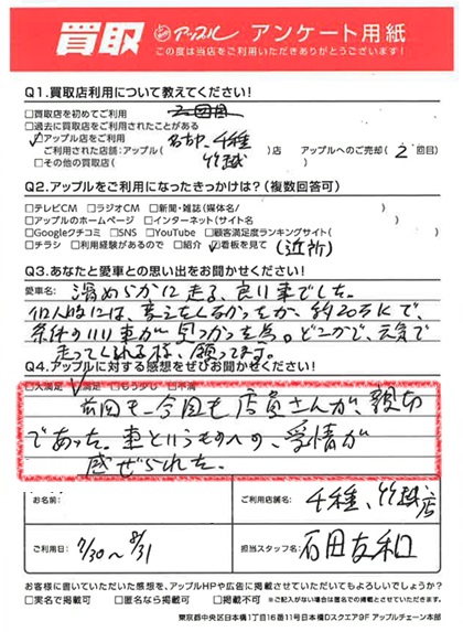 お車のご相談・ 査定だけでもOK! カンタン 入力 30秒 アップルがブランド買取始めました! お電話でも受付中! 受付時間9:30~18:30 052-711-8400 お車のご相談・ 査定だけでもOK! カンタン 入力 30秒 アップルがブランド買取始めました! お電話でも受付中! 受付時間9:30~18:30 052-711-8400 アップルがブランド買取始めました! お電話でも受付中! 受付時間9:30~18:30 052-711-8400 店舗情報 在庫車 スタッフ紹介 ブログ お客様の声 キャンペーン 無料査定 click お客様の声 ご記入日: 2023/07/30 A様 車名:日産 キャラバン 満足度★★★★前回も今回も、店員さんが親切であった。車というものへの愛情が感ぜられた。 前へ 次へ お客様の声一覧を見る