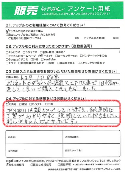 お車のご相談・ 査定だけでもOK! カンタン 入力 30秒 アップルがブランド買取始めました! お電話でも受付中! 受付時間9:30~18:30 052-711-8400 お車のご相談・ 査定だけでもOK! カンタン 入力 30秒 アップルがブランド買取始めました! お電話でも受付中! 受付時間9:30~18:30 052-711-8400 アップルがブランド買取始めました! お電話でも受付中! 受付時間9:30~18:30 052-711-8400 店舗情報 在庫車 スタッフ紹介 ブログ お客様の声 キャンペーン 無料査定 click お客様の声 ご記入日: 2023/07/19 M様 車名:トヨタ ノア 満足度★★★★★やり取りは親切にしていただき、納車時は丁寧で分かりやすく説明して頂きました。話しやすいでよかったです。 前へ 次へ お客様の声一覧を見る