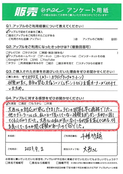大西さんの対応が安心できました。LINEの回答も早く適格でした。