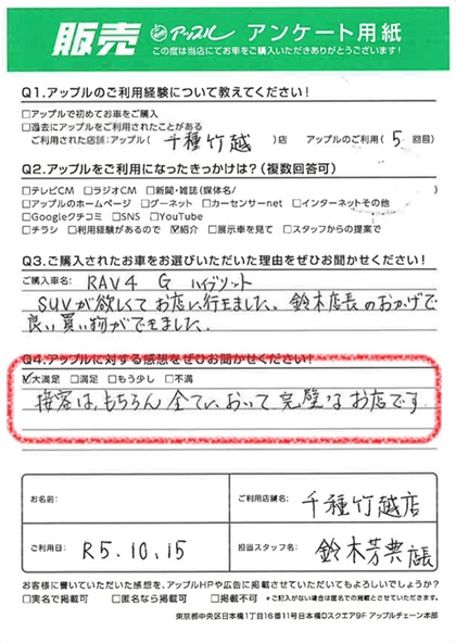 お車のご相談・ 査定だけでもOK! カンタン 入力 30秒 アップルがブランド買取始めました! お電話でも受付中! 受付時間9:30~18:30 052-711-8400 お車のご相談・ 査定だけでもOK! カンタン 入力 30秒 アップルがブランド買取始めました! お電話でも受付中! 受付時間9:30~18:30 052-711-8400 アップルがブランド買取始めました! お電話でも受付中! 受付時間9:30~18:30 052-711-8400 店舗情報 在庫車 スタッフ紹介 ブログ お客様の声 キャンペーン 無料査定 click お客様の声 ご記入日: 2023/10/15 K様 車名:トヨタ RAV4(R04年10月~RAV4 PHV含む) 満足度★★★★★接客はもちろん、全てにおいて完璧なお店です。 前へ 次へ お客様の声一覧を見る
