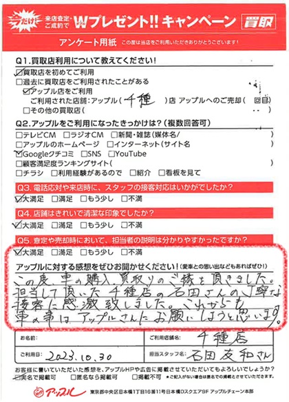 担当して頂いた千種店の石田さんの丁寧な接客に感激致しました。