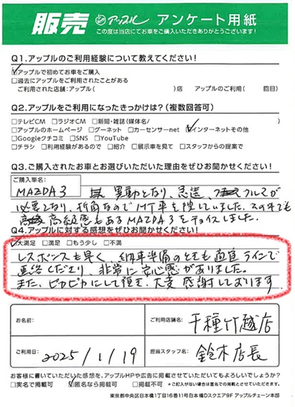 お車のご相談・ 査定だけでもOK! カンタン 入力 30秒 アップルがブランド買取始めました! お電話でも受付中! 受付時間9:30~18:30 052-711-8400 お車のご相談・ 査定だけでもOK! カンタン 入力 30秒 アップルがブランド買取始めました! お電話でも受付中! 受付時間9:30~18:30 052-711-8400 アップルがブランド買取始めました! お電話でも受付中! 受付時間9:30~18:30 052-711-8400 店舗情報 在庫車 スタッフ紹介 ブログ お客様の声 キャンペーン 無料査定 click お客様の声 ご記入日: 2025/01/19 S様 車名:マツダ MAZDA3ファストバック 満足度★★★★★ レスポンスも早く、納車準備のときも適宜ラインで連絡くださり、非常に安心感がありました。また、ピカピカにして頂き、大変感謝しております。 前へ 次へ お客様の声一覧を見る