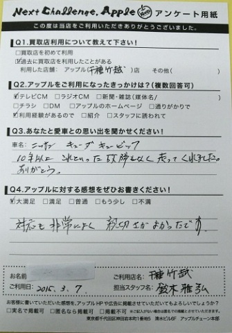お車のご相談・ 査定だけでもOK! カンタン 入力 30秒 アップルがブランド買取始めました! お電話でも受付中! 受付時間9:30~18:30 052-711-8400 お車のご相談・ 査定だけでもOK! カンタン 入力 30秒 アップルがブランド買取始めました! お電話でも受付中! 受付時間9:30~18:30 052-711-8400 アップルがブランド買取始めました! お電話でも受付中! 受付時間9:30~18:30 052-711-8400 店舗情報 在庫車 スタッフ紹介 ブログ お客様の声 キャンペーン 無料査定 click お客様の声 ご記入日: 2015/03/07 H・N様 ■ご利用日時■ H27年3月7日■車種■ 日産キューブ■担当者■ 鈴木【アップルに対する感想をぜひお書きください】満足度★★★★★対応も非常によく 親切さがよかったです。 前へ 次へ お客様の声一覧を見る
