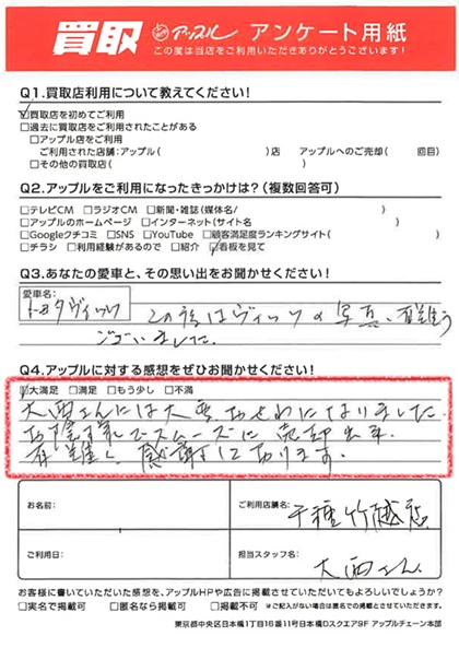 お車のご相談・ 査定だけでもOK! カンタン 入力 30秒 アップルがブランド買取始めました! お電話でも受付中! 受付時間9:30~18:30 052-711-8400 お車のご相談・ 査定だけでもOK! カンタン 入力 30秒 アップルがブランド買取始めました! お電話でも受付中! 受付時間9:30~18:30 052-711-8400 アップルがブランド買取始めました! お電話でも受付中! 受付時間9:30~18:30 052-711-8400 店舗情報 在庫車 スタッフ紹介 ブログ お客様の声 キャンペーン 無料査定 click お客様の声 ご記入日: 2025/07/24 S様 車名:トヨタ ヴィッツ 満足度★★★★★大西さんには大変お世話になりました。お陰様でスムーズに売却でき、有難く感謝しております。 前へ 次へ お客様の声一覧を見る