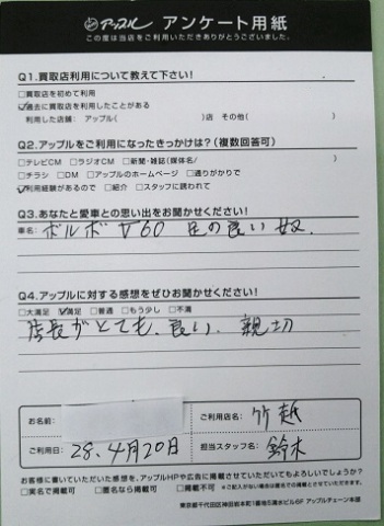 お車のご相談・ 査定だけでもOK! カンタン 入力 30秒 アップルがブランド買取始めました! お電話でも受付中! 受付時間9:30~18:30 052-711-8400 お車のご相談・ 査定だけでもOK! カンタン 入力 30秒 アップルがブランド買取始めました! お電話でも受付中! 受付時間9:30~18:30 052-711-8400 アップルがブランド買取始めました! お電話でも受付中! 受付時間9:30~18:30 052-711-8400 店舗情報 在庫車 スタッフ紹介 ブログ お客様の声 キャンペーン 無料査定 click お客様の声 ご記入日: 2016/04/20 A・H様 ■ご利用日時■ H28年4月20日■車種■ ボルボ■担当者■ 鈴木【アップルに対する感想をぜひお書きください】満足度★★★★★店長がとても良い 親切 前へ 次へ お客様の声一覧を見る