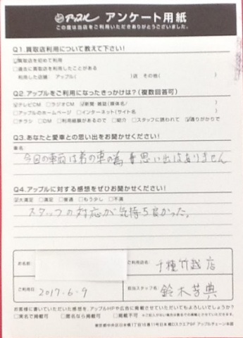 お車のご相談・ 査定だけでもOK! カンタン 入力 30秒 アップルがブランド買取始めました! お電話でも受付中! 受付時間9:30~18:30 052-711-8400 お車のご相談・ 査定だけでもOK! カンタン 入力 30秒 アップルがブランド買取始めました! お電話でも受付中! 受付時間9:30~18:30 052-711-8400 アップルがブランド買取始めました! お電話でも受付中! 受付時間9:30~18:30 052-711-8400 店舗情報 在庫車 スタッフ紹介 ブログ お客様の声 キャンペーン 無料査定 click お客様の声 ご記入日: 2017/06/09 M・H様 ■ご利用日時■ H 29 年 6 月 9 日■車種■ トライトン■担当者■ 鈴木店長《アップルに対する感想をぜひお書きください》満足度★★★★★スタッフの対応が気持ち良かった。 前へ 次へ お客様の声一覧を見る