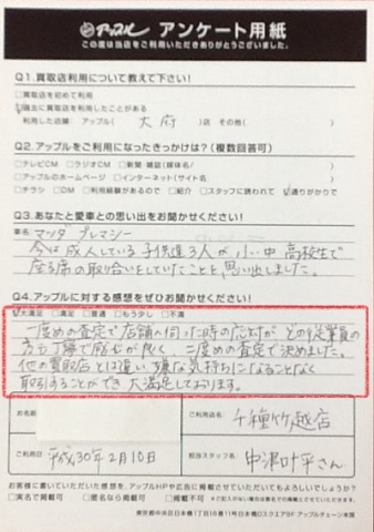 一度目の査定で店舗へ伺ったときの応対がどの従業員の方も丁寧で感じが良く二度目の査定で決めました。