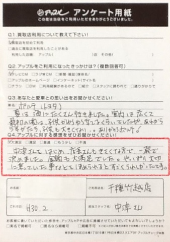 中津さんをはじめ、店長さんもきさくな方で、一発で決めました。金額も大満足でした。やっぱり大切に乗っていた事などをほめられるとすごくうれしかったです。