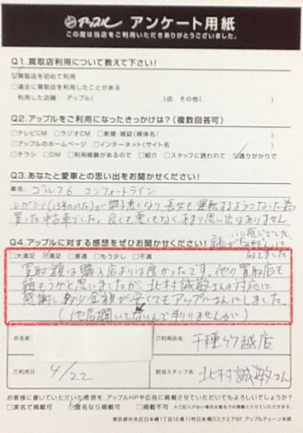 他の買取店も頼もうかと思いましたが、北村誠敏さんの対応に感謝し、 多少金額が安くても(他店を聞いてないので判りませんが)アップルさんにしました。
