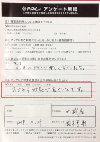 お車のご相談・ 査定だけでもOK! カンタン 入力 30秒 アップルがブランド買取始めました! お電話でも受付中! 受付時間9:30~18:30 052-711-8400 お車のご相談・ 査定だけでもOK! カンタン 入力 30秒 アップルがブランド買取始めました! お電話でも受付中! 受付時間9:30~18:30 052-711-8400 アップルがブランド買取始めました! お電話でも受付中! 受付時間9:30~18:30 052-711-8400 店舗情報 在庫車 スタッフ紹介 ブログ お客様の声 キャンペーン 無料査定 click お客様の声 ご記入日: 2018/10/29 I・T様 ■ご利用日時■ H 30 年 10 月 29 日■車種■ モコ■担当者■ 鈴木店長《アップルに対する感想をぜひお書きください》満足度★★★★★スバヤイ対応で良かったです。 前へ 次へ お客様の声一覧を見る