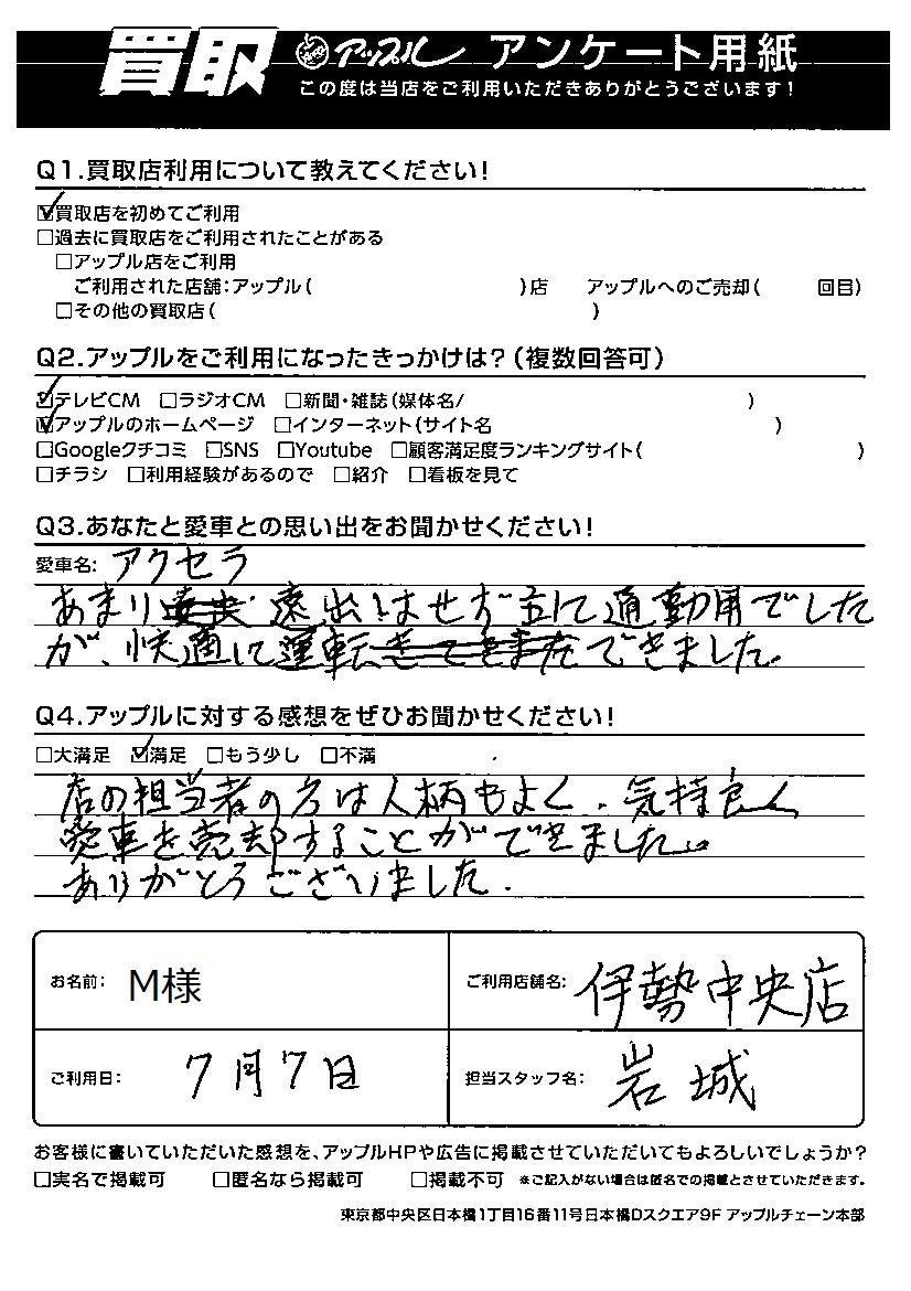 M様 車名:マツダ アクセラ