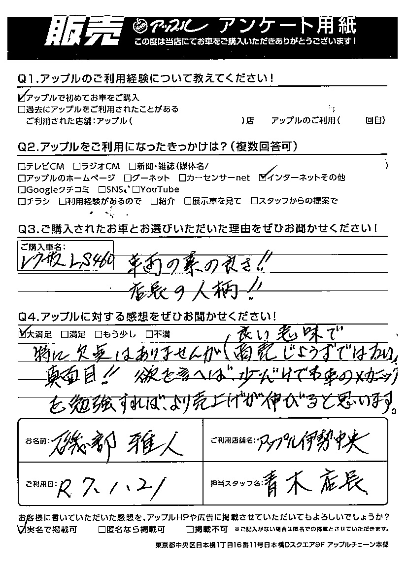 A.ご購入車名:レクサスLS460 車輌の素の良さ!!店長の人柄!!