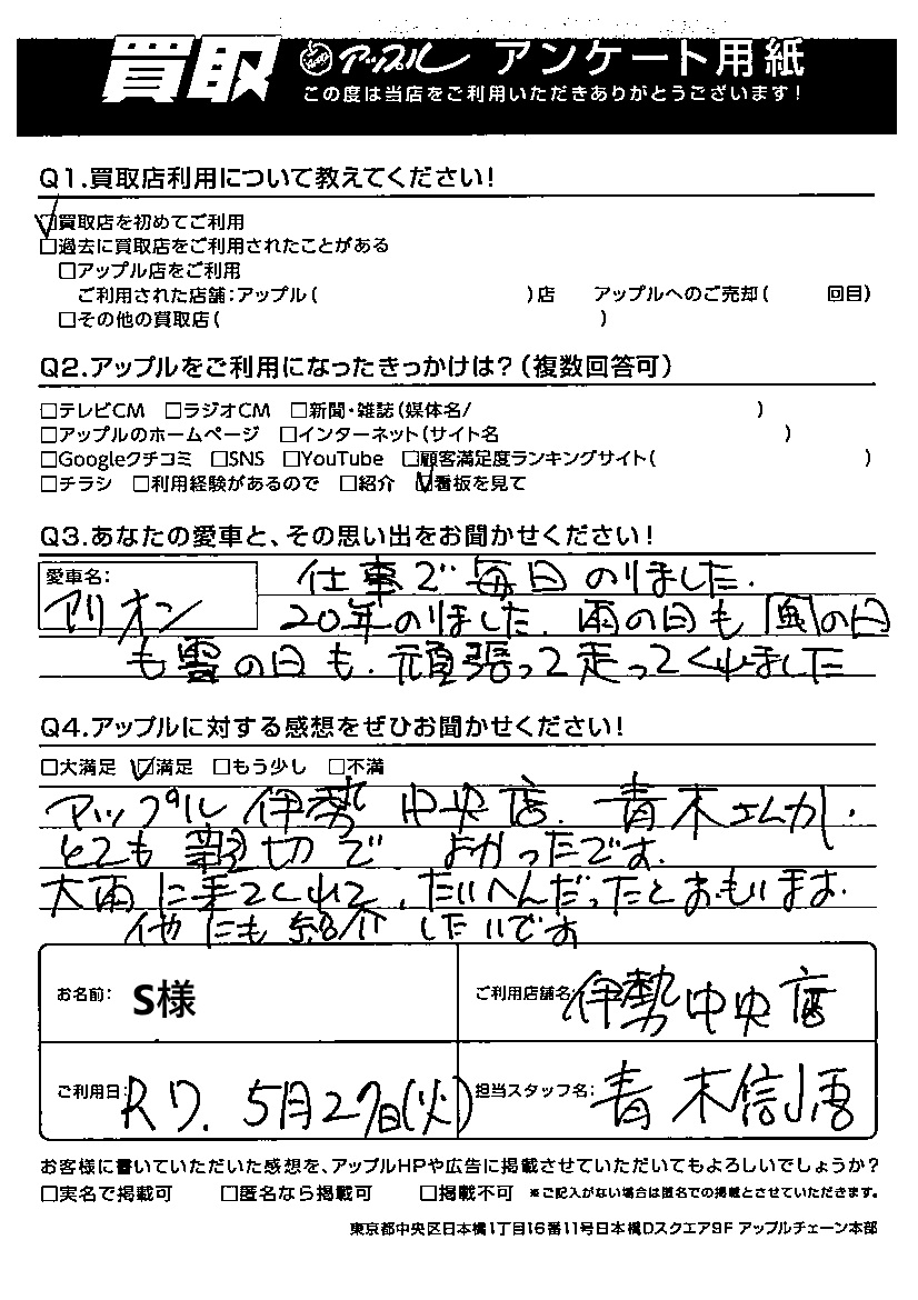 S様 車名:トヨタ アリオン
