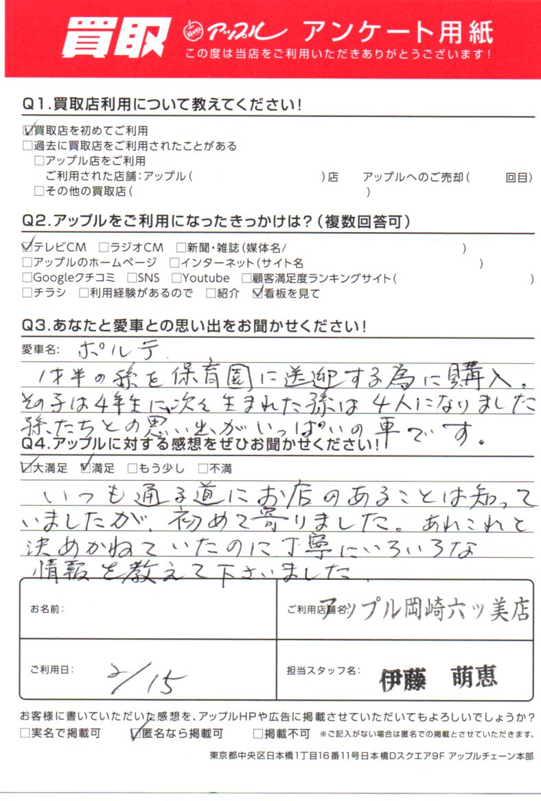 お車のご相談・ 査定だけでもOK! カンタン 入力 30秒 アップルがブランド買取始めました! お電話でも受付中! 受付時間10:00 ~ 19:00 (第4・第5月曜日は18:00閉店の場合あり) 0564-58-1700 お車のご相談・ 査定だけでもOK! カンタン 入力 30秒 アップルがブランド買取始めました! お電話でも受付中! 受付時間10:00 ~ 19:00 (第4・第5月曜日は18:00閉店の場合あり) 0564-58-1700 アップルがブランド買取始めました! お電話でも受付中! 受付時間10:00 ~ 19:00 (第4・第5月曜日は18:00閉店の場合あり) 0564-58-1700 店舗情報 在庫車 スタッフ紹介 ブログ お客様の声 キャンペーン 無料査定 click お客様の声 ご記入日: 2022/02/15 愛知県 匿名希望様 車名:トヨタ ポルテ いつも通る道にお店のあることは知っていましたが、初めて寄りました。あれこれと決めかねていたのに丁寧にいろいろな情報を教えて下さいました。 前へ 次へ お客様の声一覧を見る