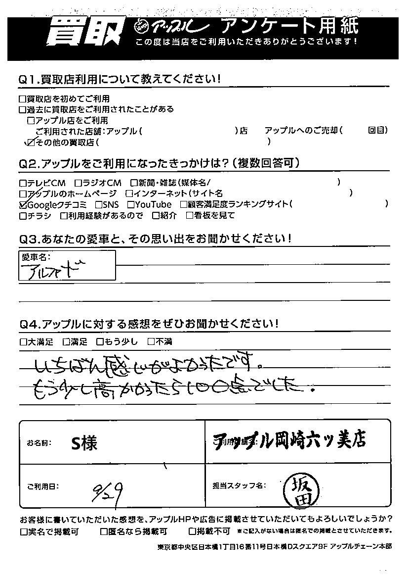 S様 車名:トヨタ アルファード(H27年1月~のHYBRID含む)