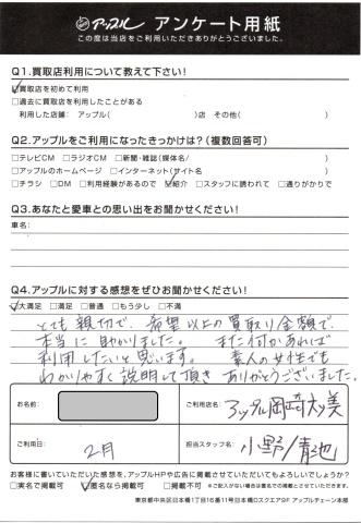 お車のご相談・ 査定だけでもOK! カンタン 入力 30秒 アップルがブランド買取始めました! お電話でも受付中! 受付時間10:00 ~ 19:00 (第4・第5月曜日は18:00閉店の場合あり) 0564-58-1700 お車のご相談・ 査定だけでもOK! カンタン 入力 30秒 アップルがブランド買取始めました! お電話でも受付中! 受付時間10:00 ~ 19:00 (第4・第5月曜日は18:00閉店の場合あり) 0564-58-1700 アップルがブランド買取始めました! お電話でも受付中! 受付時間10:00 ~ 19:00 (第4・第5月曜日は18:00閉店の場合あり) 0564-58-1700 店舗情報 在庫車 スタッフ紹介 ブログ お客様の声 キャンペーン 無料査定 click お客様の声 ご記入日: 2018/04/22 S様 とても親切で、希望以上の買取金額で本当に助かりました。また何かあれば利用したいと思います。素人の女性でもわかりやすく説明していただきありがとうございました。 前へ 次へ お客様の声一覧を見る