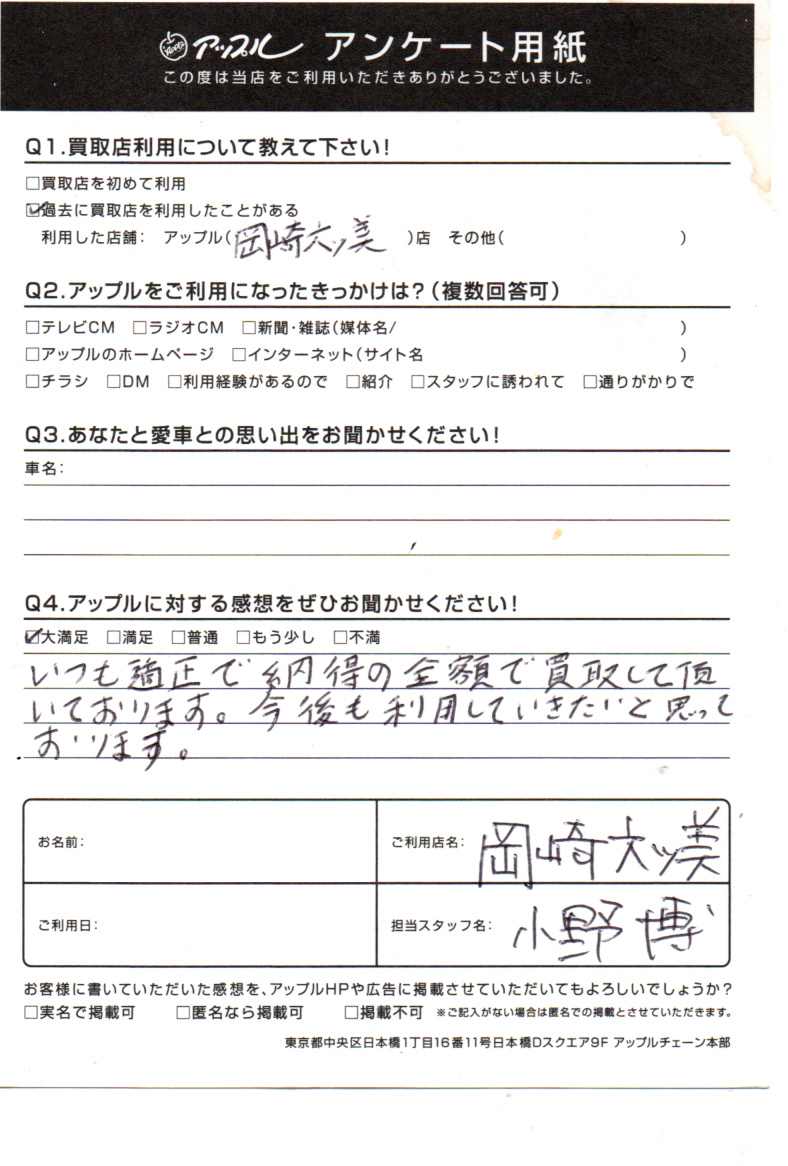 お車のご相談・ 査定だけでもOK! カンタン 入力 30秒 アップルがブランド買取始めました! お電話でも受付中! 受付時間10:00 ~ 19:00 (第4・第5月曜日は18:00閉店の場合あり) 0564-58-1700 お車のご相談・ 査定だけでもOK! カンタン 入力 30秒 アップルがブランド買取始めました! お電話でも受付中! 受付時間10:00 ~ 19:00 (第4・第5月曜日は18:00閉店の場合あり) 0564-58-1700 アップルがブランド買取始めました! お電話でも受付中! 受付時間10:00 ~ 19:00 (第4・第5月曜日は18:00閉店の場合あり) 0564-58-1700 店舗情報 在庫車 スタッフ紹介 ブログ お客様の声 キャンペーン 無料査定 click お客様の声 ご記入日: 2019/03/01 匿名希望様 いつも適正で納得の金額で買取して頂いております。今後も利用していきたいと思っております。 前へ 次へ お客様の声一覧を見る