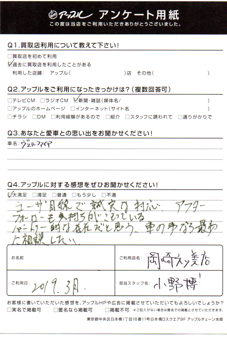 お車のご相談・ 査定だけでもOK! カンタン 入力 30秒 アップルがブランド買取始めました! お電話でも受付中! 受付時間10:00 ~ 19:00 (第4・第5月曜日は18:00閉店の場合あり) 0564-58-1700 お車のご相談・ 査定だけでもOK! カンタン 入力 30秒 アップルがブランド買取始めました! お電話でも受付中! 受付時間10:00 ~ 19:00 (第4・第5月曜日は18:00閉店の場合あり) 0564-58-1700 アップルがブランド買取始めました! お電話でも受付中! 受付時間10:00 ~ 19:00 (第4・第5月曜日は18:00閉店の場合あり) 0564-58-1700 店舗情報 在庫車 スタッフ紹介 ブログ お客様の声 キャンペーン 無料査定 click お客様の声 ご記入日: 2019/03/01 匿名希望様 車名:トヨタ ヴェルファイア(H27年1月~のHYBRID含む) ユーザー目線で誠実な対応 アフターフォローも気持ちがこもっている パートナー的な存在だと思う 車の事なら最初に相談したい 前へ 次へ お客様の声一覧を見る