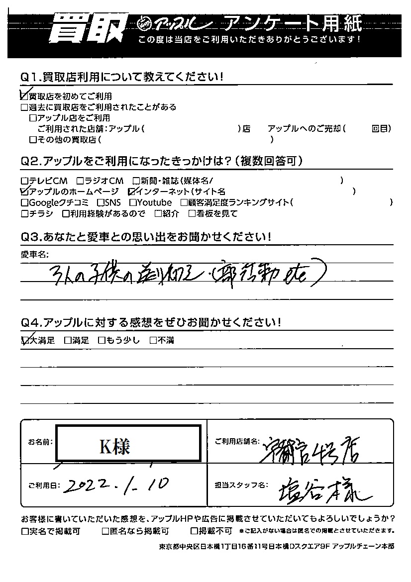 お車のご相談・ 査定だけでもOK! カンタン 入力 30秒 アップルがブランド買取始めました! お電話でも受付中! 受付時間10:00 ~ 19:00 028-612-3335 お車のご相談・ 査定だけでもOK! カンタン 入力 30秒 アップルがブランド買取始めました! お電話でも受付中! 受付時間10:00 ~ 19:00 028-612-3335 アップルがブランド買取始めました! お電話でも受付中! 受付時間10:00 ~ 19:00 028-612-3335 店舗情報 在庫車 スタッフ紹介 ブログ お客様の声 キャンペーン 無料査定 click お客様の声 ご記入日: 2022/01/10 K様 Q あなたと愛車との思い出をお聞かせください!3人の子供の送り迎え(部活動etc)Q アップルに対する感想をぜひお聞かせください!感想:大満足 前へ 次へ お客様の声一覧を見る