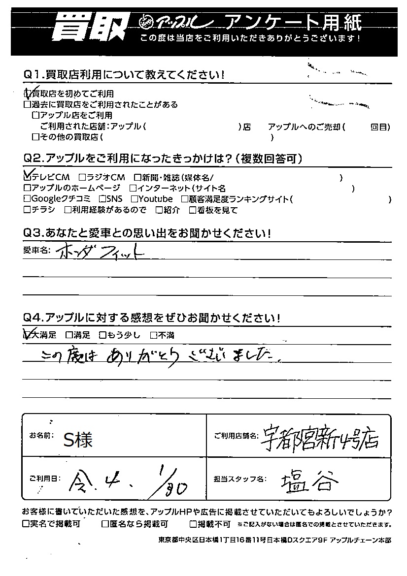 お車のご相談・ 査定だけでもOK! カンタン 入力 30秒 アップルがブランド買取始めました! お電話でも受付中! 受付時間10:00 ~ 19:00 028-612-3335 お車のご相談・ 査定だけでもOK! カンタン 入力 30秒 アップルがブランド買取始めました! お電話でも受付中! 受付時間10:00 ~ 19:00 028-612-3335 アップルがブランド買取始めました! お電話でも受付中! 受付時間10:00 ~ 19:00 028-612-3335 店舗情報 在庫車 スタッフ紹介 ブログ お客様の声 キャンペーン 無料査定 click お客様の声 ご記入日: 2022/01/30 S様 車名:ホンダ フィット(H25年9月以降のハイブリッド含む) Q アップルに対する感想をぜひお聞かせください!感想:大満足この度はありがとうございました。 前へ 次へ お客様の声一覧を見る