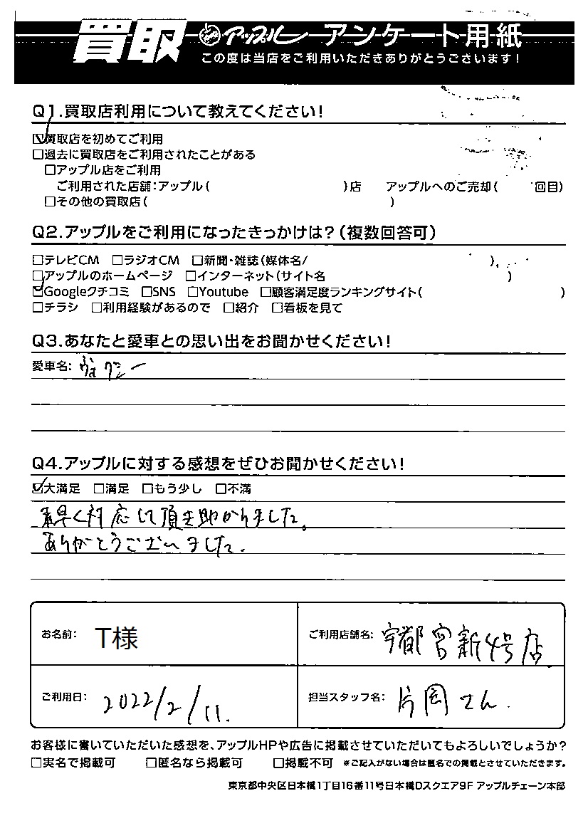 お車のご相談・ 査定だけでもOK! カンタン 入力 30秒 アップルがブランド買取始めました! お電話でも受付中! 受付時間10:00 ~ 19:00 028-612-3335 お車のご相談・ 査定だけでもOK! カンタン 入力 30秒 アップルがブランド買取始めました! お電話でも受付中! 受付時間10:00 ~ 19:00 028-612-3335 アップルがブランド買取始めました! お電話でも受付中! 受付時間10:00 ~ 19:00 028-612-3335 店舗情報 在庫車 スタッフ紹介 ブログ お客様の声 キャンペーン 無料査定 click お客様の声 ご記入日: 2022/02/11 T様 車名:トヨタ ヴォクシー Q アップルに対する感想をぜひお聞かせください!感想:大満足素早く対応して頂き助かりました。ありがとうございました。 前へ 次へ お客様の声一覧を見る
