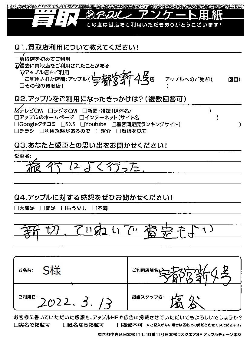 お車のご相談・ 査定だけでもOK! カンタン 入力 30秒 アップルがブランド買取始めました! お電話でも受付中! 受付時間10:00 ~ 19:00 028-612-3335 お車のご相談・ 査定だけでもOK! カンタン 入力 30秒 アップルがブランド買取始めました! お電話でも受付中! 受付時間10:00 ~ 19:00 028-612-3335 アップルがブランド買取始めました! お電話でも受付中! 受付時間10:00 ~ 19:00 028-612-3335 店舗情報 在庫車 スタッフ紹介 ブログ お客様の声 キャンペーン 無料査定 click お客様の声 ご記入日: 2022/03/13 S様 Q あなたと愛車との思い出をお聞かせください!旅行によく行ったQ アップルに対する感想をぜひお聞かせください!親切、ていねいで査定もよい 前へ 次へ お客様の声一覧を見る