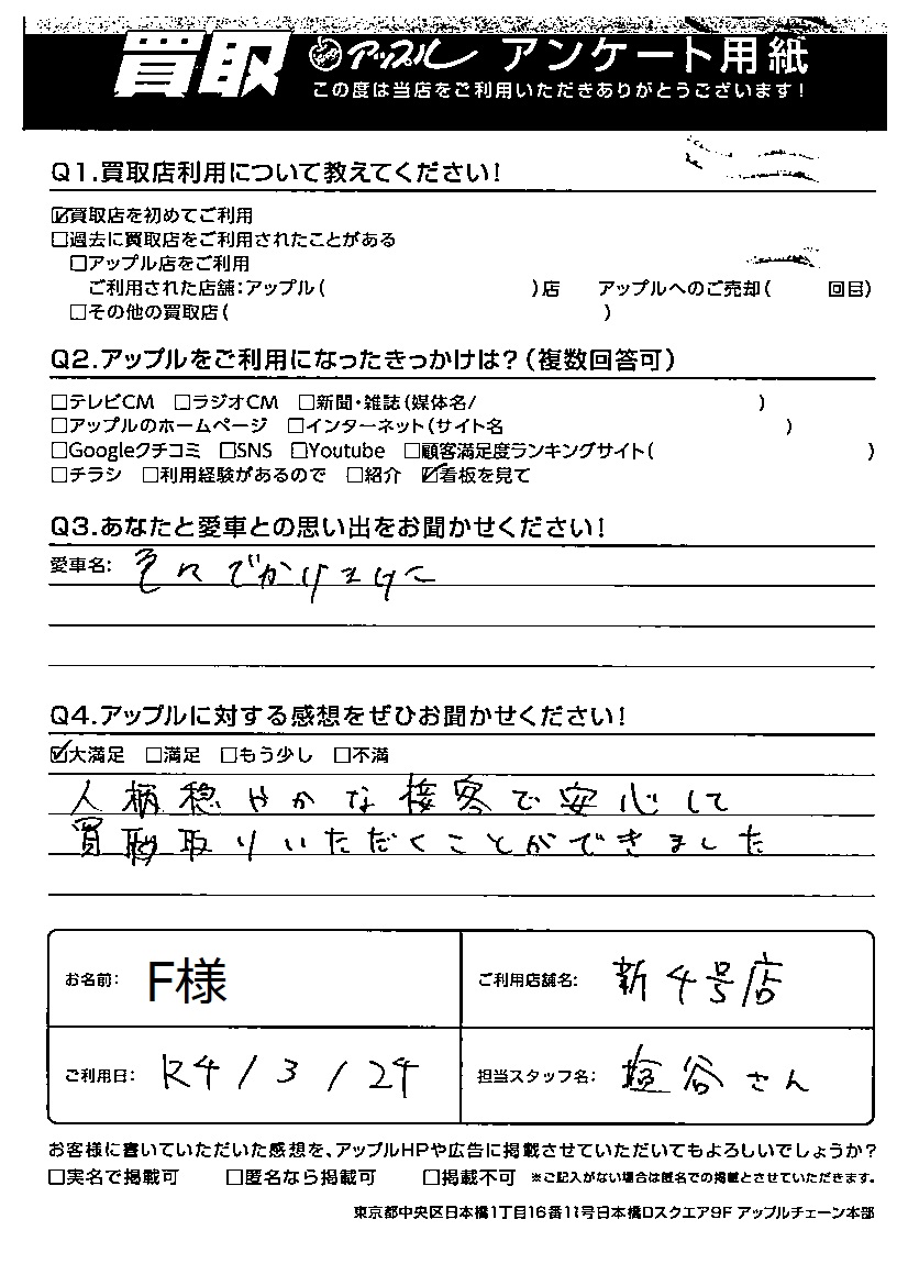 お車のご相談・ 査定だけでもOK! カンタン 入力 30秒 アップルがブランド買取始めました! お電話でも受付中! 受付時間10:00 ~ 19:00 028-612-3335 お車のご相談・ 査定だけでもOK! カンタン 入力 30秒 アップルがブランド買取始めました! お電話でも受付中! 受付時間10:00 ~ 19:00 028-612-3335 アップルがブランド買取始めました! お電話でも受付中! 受付時間10:00 ~ 19:00 028-612-3335 店舗情報 在庫車 スタッフ紹介 ブログ お客様の声 キャンペーン 無料査定 click お客様の声 ご記入日: 2022/03/24 F様 Q あなたと愛車との思い出をお聞かせください!色々でかけました。Q アップルに対する感想をぜひお聞かせください!感想:大満足人柄穏やかな接客で安心して買取りいただくことができました。 前へ 次へ お客様の声一覧を見る