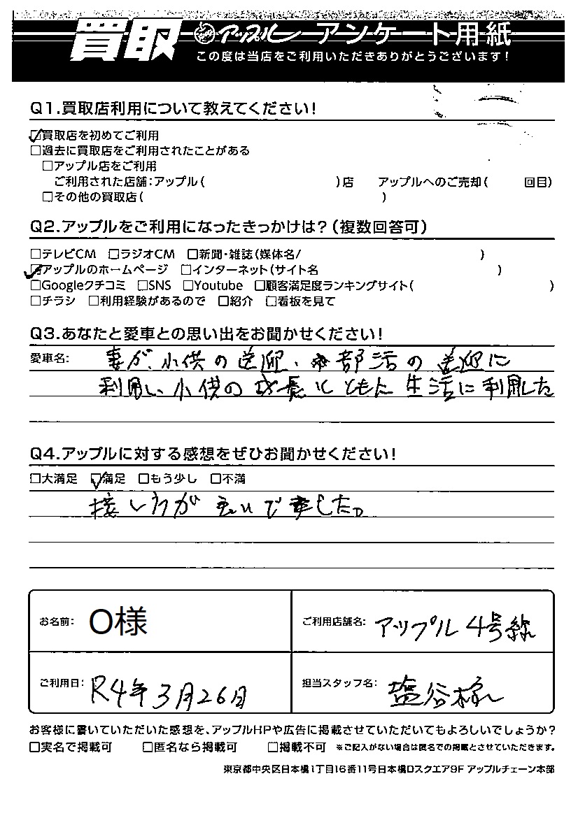 お車のご相談・ 査定だけでもOK! カンタン 入力 30秒 アップルがブランド買取始めました! お電話でも受付中! 受付時間10:00 ~ 19:00 028-612-3335 お車のご相談・ 査定だけでもOK! カンタン 入力 30秒 アップルがブランド買取始めました! お電話でも受付中! 受付時間10:00 ~ 19:00 028-612-3335 アップルがブランド買取始めました! お電話でも受付中! 受付時間10:00 ~ 19:00 028-612-3335 店舗情報 在庫車 スタッフ紹介 ブログ お客様の声 キャンペーン 無料査定 click お客様の声 ご記入日: 2022/03/26 O様 Q あなたと愛車との思い出をお聞かせください!妻が子供の送迎、部活の送迎に利用し子供の成長とともに生活に利用した。Q アップルに対する感想をぜひお聞かせください!感想:満足接し方が良いでした。 前へ 次へ お客様の声一覧を見る