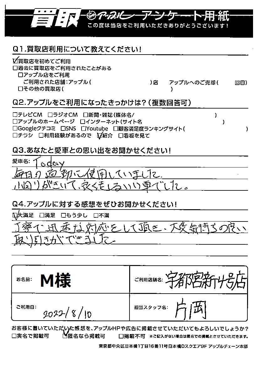 M様 車名:ホンダ トゥデイ