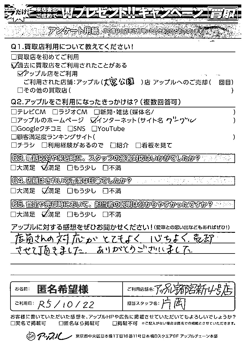 お車のご相談・ 査定だけでもOK! カンタン 入力 30秒 アップルがブランド買取始めました! お電話でも受付中! 受付時間10:00 ~ 19:00 028-612-3335 お車のご相談・ 査定だけでもOK! カンタン 入力 30秒 アップルがブランド買取始めました! お電話でも受付中! 受付時間10:00 ~ 19:00 028-612-3335 アップルがブランド買取始めました! お電話でも受付中! 受付時間10:00 ~ 19:00 028-612-3335 店舗情報 在庫車 スタッフ紹介 ブログ お客様の声 キャンペーン 無料査定 click お客様の声 ご記入日: 2023/10/22 匿名希望様 ご利用日:2023年10月22日担当:片岡Q:アップルに対する感想をぜひお聞かせください!A:満足 店員さんの対応がとてもよく心地よく売却させて頂きました。 ありがとうございました。 前へ 次へ お客様の声一覧を見る