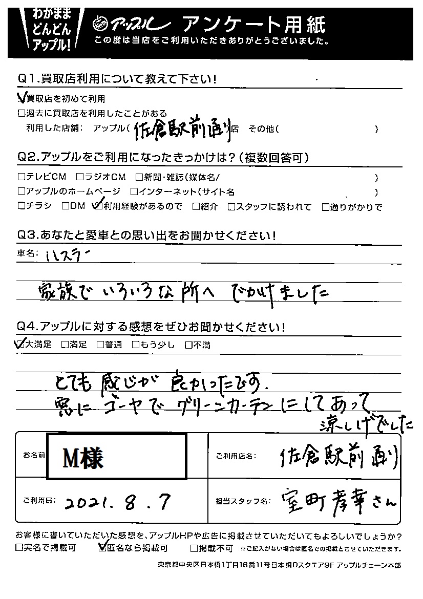 お車のご相談・ 査定だけでもOK! カンタン 入力 30秒 アップルがブランド買取始めました! お電話でも受付中! 受付時間10:00 ~ 18:30 0120-978-553 お車のご相談・ 査定だけでもOK! カンタン 入力 30秒 アップルがブランド買取始めました! お電話でも受付中! 受付時間10:00 ~ 18:30 0120-978-553 アップルがブランド買取始めました! お電話でも受付中! 受付時間10:00 ~ 18:30 0120-978-553 店舗情報 在庫車 スタッフ紹介 ブログ お客様の声 キャンペーン お得 無料査定 click お客様の声 ご記入日: 2021/08/07 M様 車名:スズキ ハスラー Q あなたと愛車との思い出をお聞かせください!家族でいろいろな所へでかけました。Q アップルに対する感想をぜひお聞かせください!感想:大満足とても感じが良かったです。窓にゴーヤでグリーンカーテンにしてあって涼しげでした。 前へ 次へ お客様の声一覧を見る