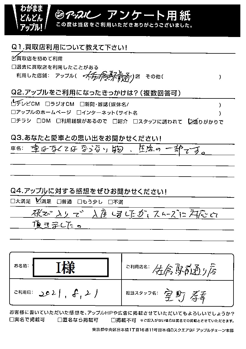 お車のご相談・ 査定だけでもOK! カンタン 入力 30秒 アップルがブランド買取始めました! お電話でも受付中! 受付時間10:00 ~ 18:30 0120-978-553 お車のご相談・ 査定だけでもOK! カンタン 入力 30秒 アップルがブランド買取始めました! お電話でも受付中! 受付時間10:00 ~ 18:30 0120-978-553 アップルがブランド買取始めました! お電話でも受付中! 受付時間10:00 ~ 18:30 0120-978-553 店舗情報 在庫車 スタッフ紹介 ブログ お客様の声 キャンペーン お得 無料査定 click お客様の声 ご記入日: 2021/08/21 I様 Q あなたと愛車との思い出をお聞かせください!車はなくてはならない物、生活の一部です。Q アップルに対する感想をぜひお聞かせください!感想:満足飛び入りで入店しましたが、スムーズに対応して頂きました。 前へ 次へ お客様の声一覧を見る