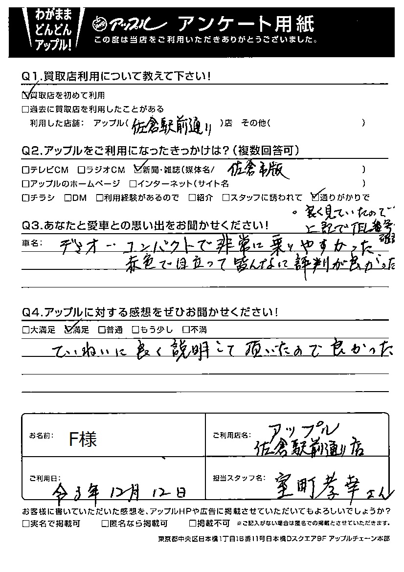 お車のご相談・ 査定だけでもOK! カンタン 入力 30秒 アップルがブランド買取始めました! お電話でも受付中! 受付時間10:00 ~ 18:30 0120-978-553 お車のご相談・ 査定だけでもOK! カンタン 入力 30秒 アップルがブランド買取始めました! お電話でも受付中! 受付時間10:00 ~ 18:30 0120-978-553 アップルがブランド買取始めました! お電話でも受付中! 受付時間10:00 ~ 18:30 0120-978-553 店舗情報 在庫車 スタッフ紹介 ブログ お客様の声 キャンペーン お得 無料査定 click お客様の声 ご記入日: 2021/12/23 F様 車名:マツダ デミオ ご利用日:2021/12/12 F様 車名:デミオQ3 あなたと愛車との思い出をお聞かせください!A3 コンパクトで非常に乗りやすかった。赤色が目立ってみんなに評判が良かった。Q4 アップルに対する感想をお聞かせください!A4 ていねいに良く説明して頂いたので良かった。 前へ 次へ お客様の声一覧を見る