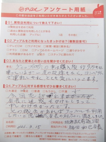 お車のご相談・ 査定だけでもOK! カンタン 入力 30秒 アップルがブランド買取始めました! お電話でも受付中! 受付時間10:00 ~ 18:30 0120-978-553 お車のご相談・ 査定だけでもOK! カンタン 入力 30秒 アップルがブランド買取始めました! お電話でも受付中! 受付時間10:00 ~ 18:30 0120-978-553 アップルがブランド買取始めました! お電話でも受付中! 受付時間10:00 ~ 18:30 0120-978-553 店舗情報 在庫車 スタッフ紹介 ブログ お客様の声 キャンペーン お得 無料査定 click お客様の声 ご記入日: 2014/03/15 C様 ★愛車との思い出車名:ヴィッツ(トヨタ)この車は購入後約9万キロ乗っているが、一度の故障もなく、コンパクトで運転しやすく、とても気にいっています。★アップルに対する感想今回売却ができず、店長に迷惑をかけてしまって、申しわけなかったです。又の機会があればアップルを利用したいと思いました。店長の対応に満足しました。 前へ 次へ お客様の声一覧を見る