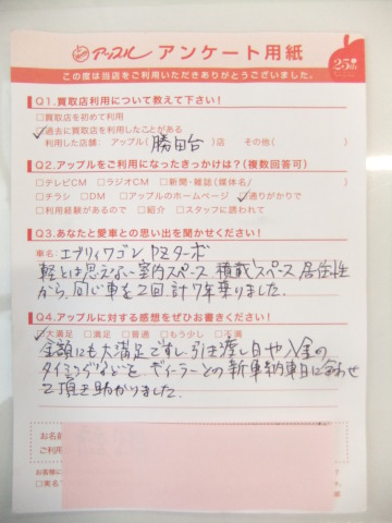 お車のご相談・ 査定だけでもOK! カンタン 入力 30秒 アップルがブランド買取始めました! お電話でも受付中! 受付時間10:00 ~ 18:30 0120-978-553 お車のご相談・ 査定だけでもOK! カンタン 入力 30秒 アップルがブランド買取始めました! お電話でも受付中! 受付時間10:00 ~ 18:30 0120-978-553 アップルがブランド買取始めました! お電話でも受付中! 受付時間10:00 ~ 18:30 0120-978-553 店舗情報 在庫車 スタッフ紹介 ブログ お客様の声 キャンペーン お得 無料査定 click お客様の声 ご記入日: 2014/07/10 K様 ★愛車との思い出(エブリィワゴンPZターボ)軽とは思えない室内スペース、積載スペース居住性から、同じ車を2回、計7年乗りました。★アップルに対する感想金額的にも大満足ですし、引き渡し日や、入金のタイミングなどをディーラーとの新車納車日に合わせて頂き助かりました。 前へ 次へ お客様の声一覧を見る