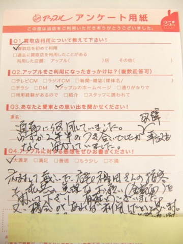 お車のご相談・ 査定だけでもOK! カンタン 入力 30秒 アップルがブランド買取始めました! お電話でも受付中! 受付時間10:00 ~ 18:30 0120-978-553 お車のご相談・ 査定だけでもOK! カンタン 入力 30秒 アップルがブランド買取始めました! お電話でも受付中! 受付時間10:00 ~ 18:30 0120-978-553 アップルがブランド買取始めました! お電話でも受付中! 受付時間10:00 ~ 18:30 0120-978-553 店舗情報 在庫車 スタッフ紹介 ブログ お客様の声 キャンペーン お得 無料査定 click お客様の声 ご記入日: 2014/10/12 A様 ★愛車との思い出通勤に使用していました。わずか2年半の付き合いでしたが故障・事故もなく安心していました。★アップルに対する感想応対して頂いた店長福田さんの接客と私共の無理なお願い(金銭面)をきいて下さり有難うございました。又、機会があれば利用したいと思います。 前へ 次へ お客様の声一覧を見る
