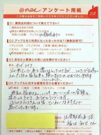 お車のご相談・ 査定だけでもOK! カンタン 入力 30秒 アップルがブランド買取始めました! お電話でも受付中! 受付時間10:00 ~ 18:30 0120-978-553 お車のご相談・ 査定だけでもOK! カンタン 入力 30秒 アップルがブランド買取始めました! お電話でも受付中! 受付時間10:00 ~ 18:30 0120-978-553 アップルがブランド買取始めました! お電話でも受付中! 受付時間10:00 ~ 18:30 0120-978-553 店舗情報 在庫車 スタッフ紹介 ブログ お客様の声 キャンペーン お得 無料査定 click お客様の声 ご記入日: 2014/11/24 I様 ★愛車との思い出(ホンダライフ)父が乗っていた車を譲ってもらったのですが、このたび父の為にスロープ付きの福祉車を購入するためやむなく手放す。★アップルに対する感想担当の福田さん、いつも めいいっぱいの金額を提示して下さり、ありがとうございます。こちらのスタッフさんは皆ていねいな対応で感心してしまいます。 前へ 次へ お客様の声一覧を見る