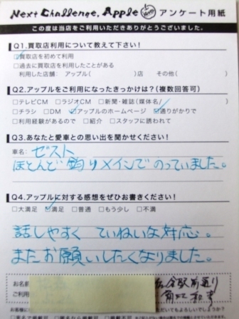 お車のご相談・ 査定だけでもOK! カンタン 入力 30秒 アップルがブランド買取始めました! お電話でも受付中! 受付時間10:00 ~ 18:30 0120-978-553 お車のご相談・ 査定だけでもOK! カンタン 入力 30秒 アップルがブランド買取始めました! お電話でも受付中! 受付時間10:00 ~ 18:30 0120-978-553 アップルがブランド買取始めました! お電話でも受付中! 受付時間10:00 ~ 18:30 0120-978-553 店舗情報 在庫車 スタッフ紹介 ブログ お客様の声 キャンペーン お得 無料査定 click お客様の声 ご記入日: 2015/05/16 M様 ★愛車との思い出(ゼスト)ほとんど釣りメインで乗っていました。★アップルに対する感想(満足)話しやすく丁寧な対応。またお願いしたくなりました。 前へ 次へ お客様の声一覧を見る