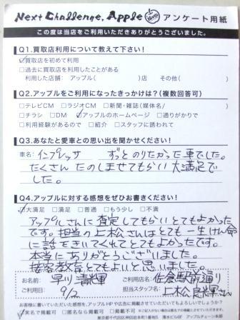 お車のご相談・ 査定だけでもOK! カンタン 入力 30秒 アップルがブランド買取始めました! お電話でも受付中! 受付時間10:00 ~ 18:30 0120-978-553 お車のご相談・ 査定だけでもOK! カンタン 入力 30秒 アップルがブランド買取始めました! お電話でも受付中! 受付時間10:00 ~ 18:30 0120-978-553 アップルがブランド買取始めました! お電話でも受付中! 受付時間10:00 ~ 18:30 0120-978-553 店舗情報 在庫車 スタッフ紹介 ブログ お客様の声 キャンペーン お得 無料査定 click お客様の声 ご記入日: 2015/10/10 早川様 ★愛車との思い出(インプレッサ)ずっと乗りたかった車でした。たくさん楽しませてもらい、大満足でした。★アップルへの感想アップルさんに査定してもらい、とても良かったです。担当の上松さんはとても一生懸命に話を聞いてくれて、とても良かったです。本当にありがとうございました。接客・教育とても良いと思いました。 前へ 次へ お客様の声一覧を見る