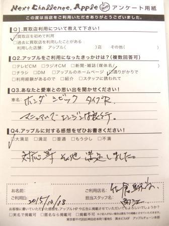 お車のご相談・ 査定だけでもOK! カンタン 入力 30秒 アップルがブランド買取始めました! お電話でも受付中! 受付時間10:00 ~ 18:30 0120-978-553 お車のご相談・ 査定だけでもOK! カンタン 入力 30秒 アップルがブランド買取始めました! お電話でも受付中! 受付時間10:00 ~ 18:30 0120-978-553 アップルがブランド買取始めました! お電話でも受付中! 受付時間10:00 ~ 18:30 0120-978-553 店舗情報 在庫車 スタッフ紹介 ブログ お客様の声 キャンペーン お得 無料査定 click お客様の声 ご記入日: 2015/12/10 M様 ★あなたとの思い出(シビックタイプR)マニュアルでエンジンは良好。★アップルに対する感想対応等、その他満足しました。 前へ 次へ お客様の声一覧を見る