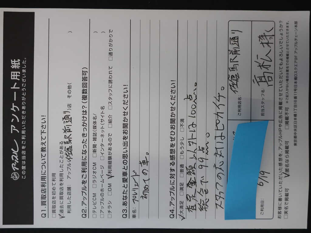お車のご相談・ 査定だけでもOK! カンタン 入力 30秒 アップルがブランド買取始めました! お電話でも受付中! 受付時間10:00 ~ 18:30 0120-978-553 お車のご相談・ 査定だけでもOK! カンタン 入力 30秒 アップルがブランド買取始めました! お電話でも受付中! 受付時間10:00 ~ 18:30 0120-978-553 アップルがブランド買取始めました! お電話でも受付中! 受付時間10:00 ~ 18:30 0120-978-553 店舗情報 在庫車 スタッフ紹介 ブログ お客様の声 キャンペーン お得 無料査定 click お客様の声 ご記入日: 2019/06/19 W様 車名:スズキ スプラッシュ ★あなたと愛車との思い出をお聞かせください!!初めての車。★アップルに対する感想をお聞かせください!!査定金額以外は100点。総合で99点。スタッフの対応はピカイチ。 前へ 次へ お客様の声一覧を見る