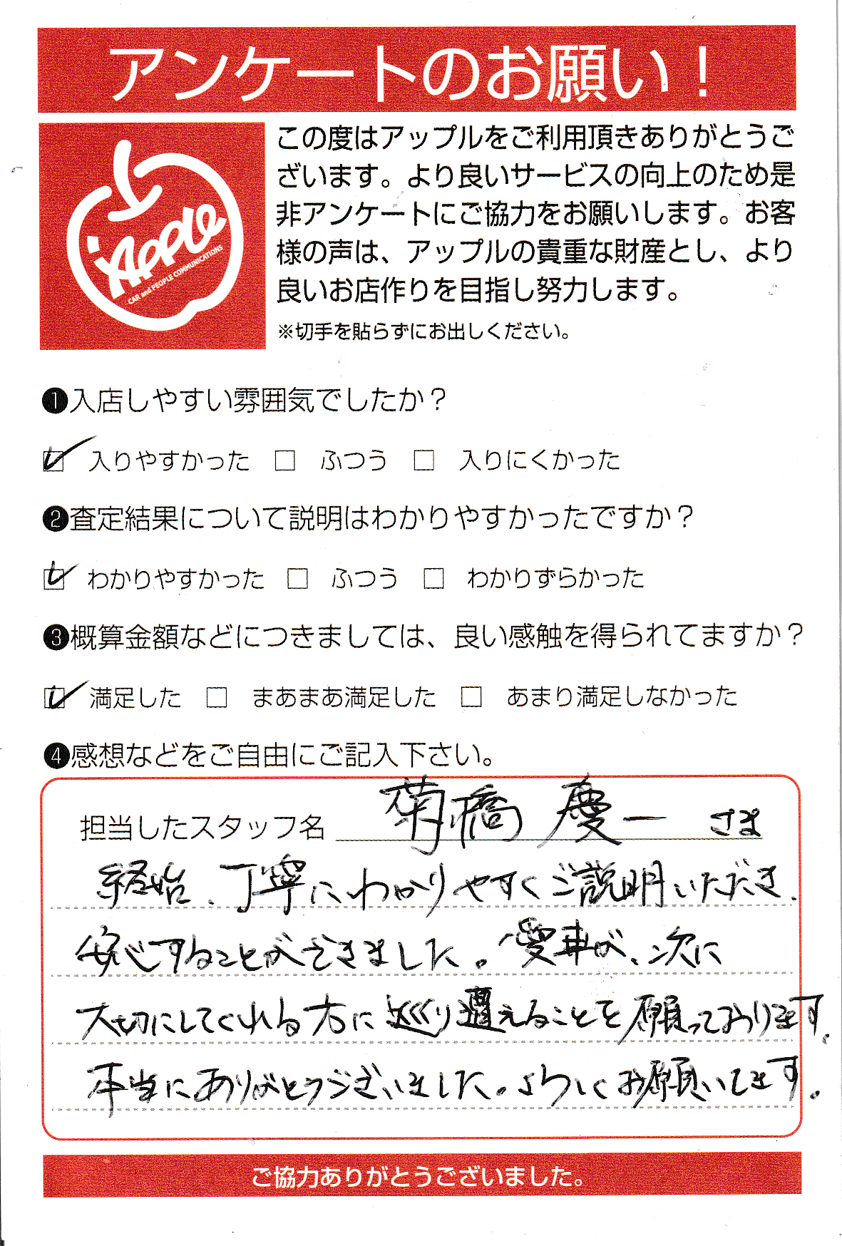 お車のご相談・ 査定だけでもOK! カンタン 入力 30秒 アップルがブランド買取始めました! お電話でも受付中! 受付時間10:00 ~ 19:00 045-828-2588 お車のご相談・ 査定だけでもOK! カンタン 入力 30秒 アップルがブランド買取始めました! お電話でも受付中! 受付時間10:00 ~ 19:00 045-828-2588 アップルがブランド買取始めました! お電話でも受付中! 受付時間10:00 ~ 19:00 045-828-2588 店舗情報 在庫車 スタッフ紹介 ブログ お客様の声 キャンペーン お得 無料査定 click お客様の声 ご記入日: 2021/06/27 T・T様 車名:トヨタ セリカ 【アップルに対する感想をぜひお聞かせください】終始、丁寧にわかりやすくご説明いただき、安心することができました。愛車が次に大切にしてくれる方に巡り遭えることを願っております。本当にありがとうございました。よろしくお願いします。 前へ 次へ お客様の声一覧を見る