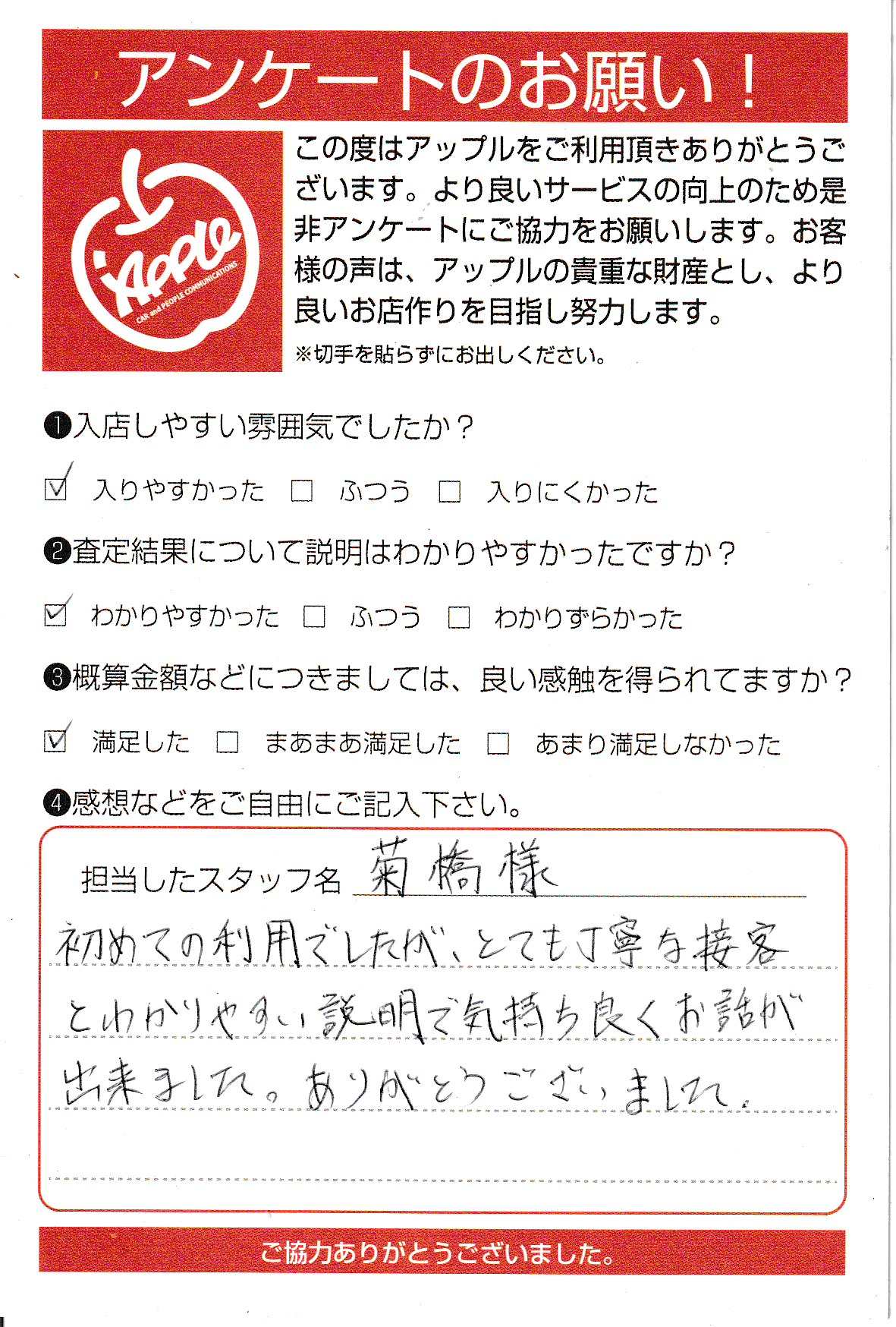 お車のご相談・ 査定だけでもOK! カンタン 入力 30秒 アップルがブランド買取始めました! お電話でも受付中! 受付時間10:00 ~ 19:00 045-828-2588 お車のご相談・ 査定だけでもOK! カンタン 入力 30秒 アップルがブランド買取始めました! お電話でも受付中! 受付時間10:00 ~ 19:00 045-828-2588 アップルがブランド買取始めました! お電話でも受付中! 受付時間10:00 ~ 19:00 045-828-2588 店舗情報 在庫車 スタッフ紹介 ブログ お客様の声 キャンペーン お得 無料査定 click お客様の声 ご記入日: 2021/07/22 M・K様 車名:日産 エクストレイル 【アップルに対する感想をぜひお聞かせください】初めての利用でしたが、とても丁寧な接客とわかりやすい説明で気持ちよくお話が出来ました。ありがとうございました。 前へ 次へ お客様の声一覧を見る