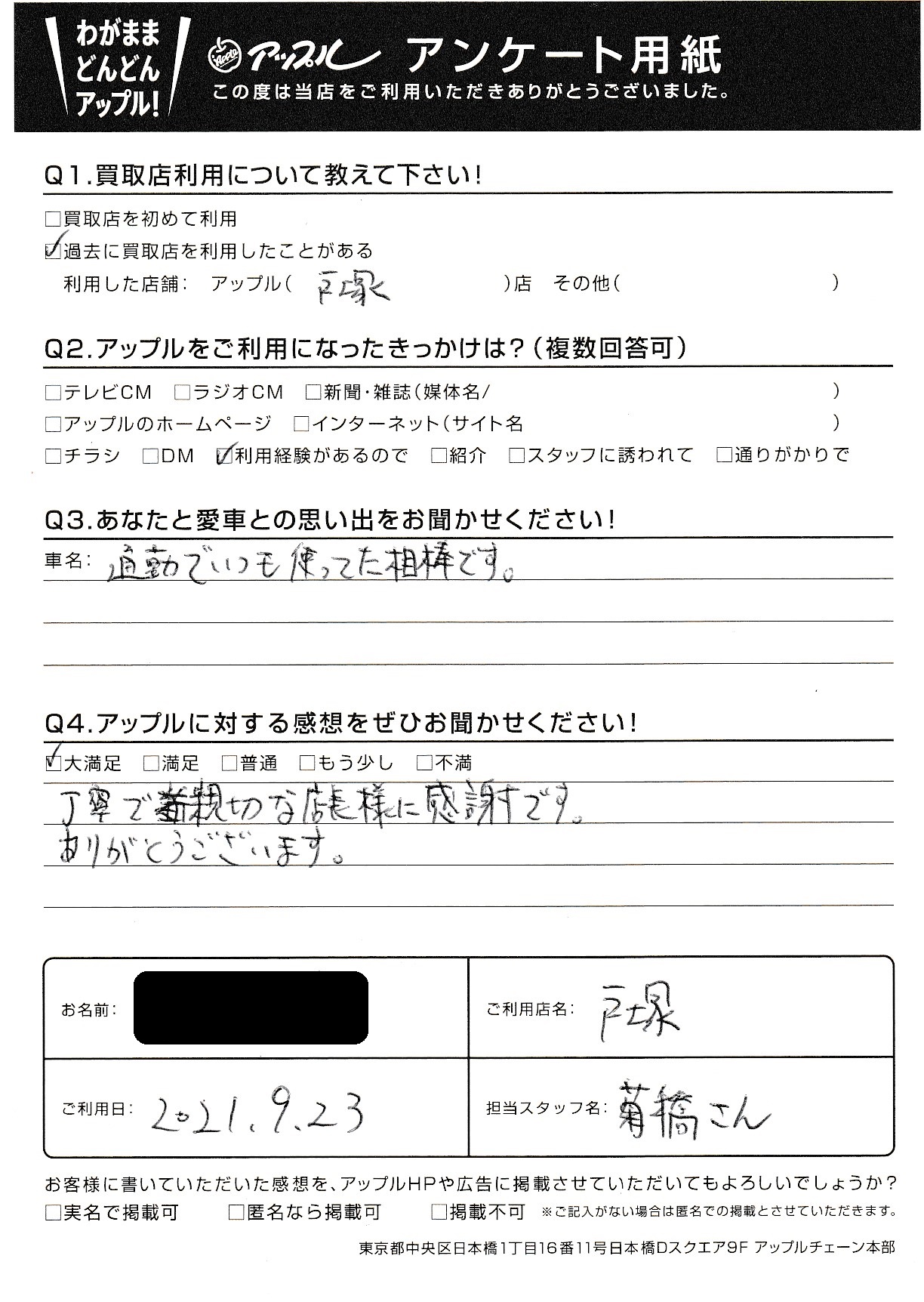 お車のご相談・ 査定だけでもOK! カンタン 入力 30秒 アップルがブランド買取始めました! お電話でも受付中! 受付時間10:00 ~ 19:00 045-828-2588 お車のご相談・ 査定だけでもOK! カンタン 入力 30秒 アップルがブランド買取始めました! お電話でも受付中! 受付時間10:00 ~ 19:00 045-828-2588 アップルがブランド買取始めました! お電話でも受付中! 受付時間10:00 ~ 19:00 045-828-2588 店舗情報 在庫車 スタッフ紹介 ブログ お客様の声 キャンペーン お得 無料査定 click お客様の声 ご記入日: 2021/09/23 Y・Y様 車名:スバル プレオプラス 【あなたと愛車との思い出をお聞かせください】通勤でいつも使ってた相棒です。【アップルに対する感想をぜひお聞かせください】丁寧で親切な店長様に感謝です。ありがとうございます。 前へ 次へ お客様の声一覧を見る