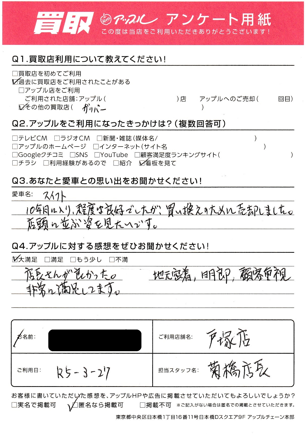 お車のご相談・ 査定だけでもOK! カンタン 入力 30秒 アップルがブランド買取始めました! お電話でも受付中! 受付時間10:00 ~ 19:00 045-828-2588 お車のご相談・ 査定だけでもOK! カンタン 入力 30秒 アップルがブランド買取始めました! お電話でも受付中! 受付時間10:00 ~ 19:00 045-828-2588 アップルがブランド買取始めました! お電話でも受付中! 受付時間10:00 ~ 19:00 045-828-2588 店舗情報 在庫車 スタッフ紹介 ブログ お客様の声 キャンペーン お得 無料査定 click お客様の声 ご記入日: 2023/03/27 H・I様 車名:スズキ スイフト 【あなたと愛車との思い出をお聞かせください】10年目に入り、程度は良好でしたが買い替えのために売却しました。店頭に並ぶ姿をみたいです。【アップルに対する感想をぜひお聞かせください】店長さんがよかった。地元密着、顧客重視、非常に満足しています。 前へ 次へ お客様の声一覧を見る