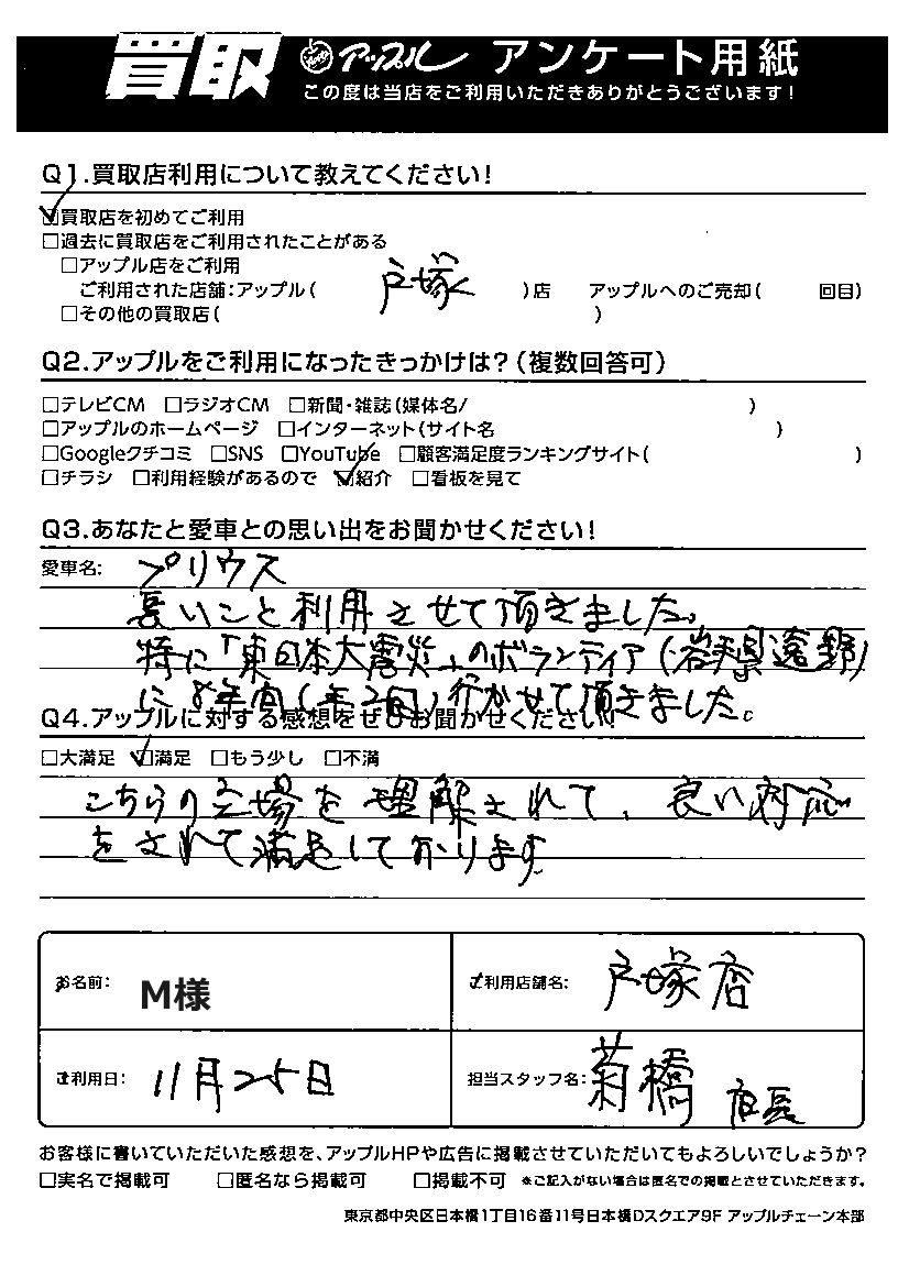 M様 車名:トヨタ プリウス(2023年3月~のPHVを含む)