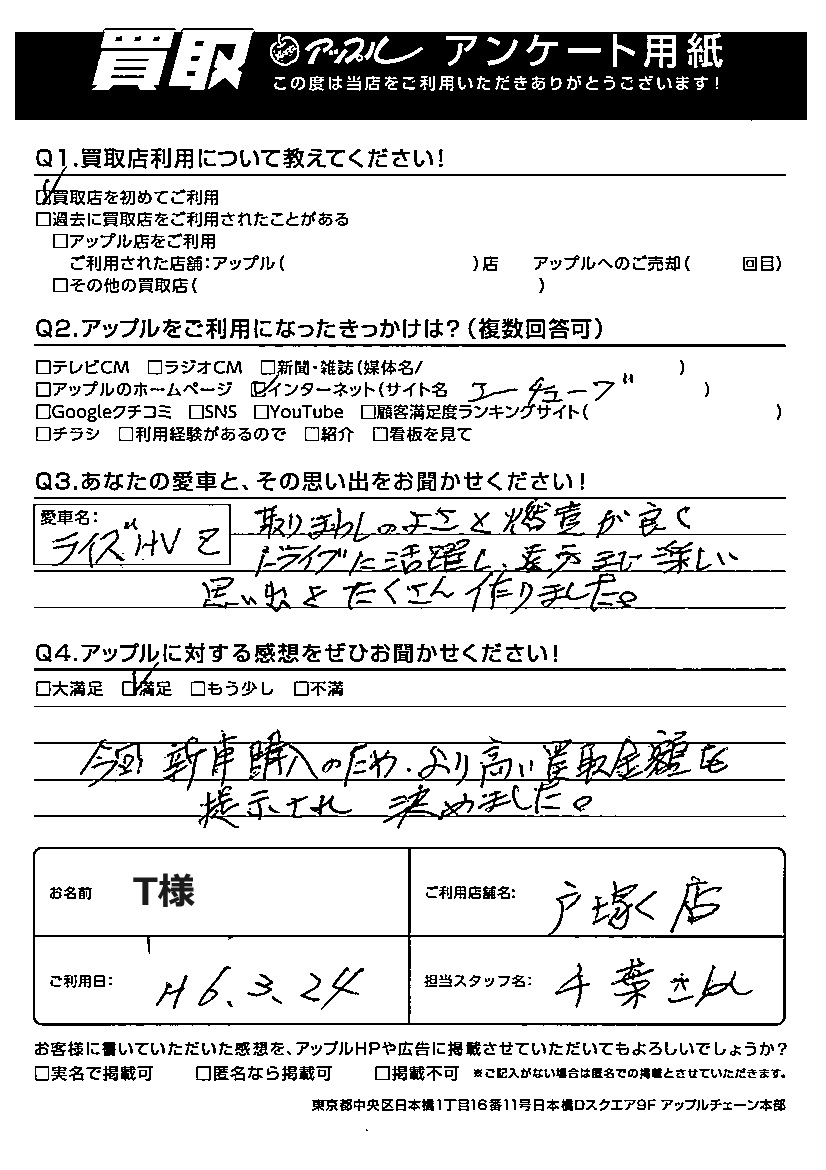 お車のご相談・ 査定だけでもOK! カンタン 入力 30秒 アップルがブランド買取始めました! お電話でも受付中! 受付時間10:00 ~ 19:00 045-828-2588 お車のご相談・ 査定だけでもOK! カンタン 入力 30秒 アップルがブランド買取始めました! お電話でも受付中! 受付時間10:00 ~ 19:00 045-828-2588 アップルがブランド買取始めました! お電話でも受付中! 受付時間10:00 ~ 19:00 045-828-2588 店舗情報 在庫車 スタッフ紹介 ブログ お客様の声 キャンペーン お得 無料査定 click お客様の声 ご記入日: 2024/05/10 T様 車名:トヨタ ライズ ご利用日:令和6年3月24日 担当:千葉あなたの愛車と、その思い出をお聞かせください!取りまわしのよさと燃費が良くドライブに活躍し、遠方まで楽しい思い出をたくさん作りました。アップルに対する感想をぜひお聞かせください!今回、新車購入のため、より高い買い取り金額を提示され決めました。 前へ 次へ お客様の声一覧を見る
